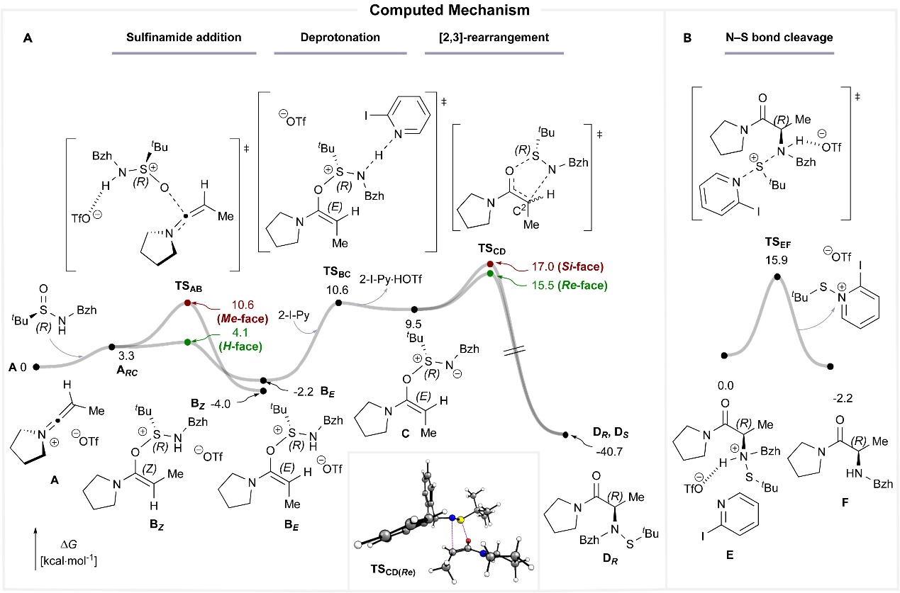 使用对映体纯亚磺酰胺对酰胺进行直接胺化。它涉及关键锍中间体的[2,3]-σ重排。进一步展示了量子化学计算,如何能够预测洞察这种氨基-乙烯氧基-锍物种的关键E/Z选择性。使用PBE0-D3(BJ)-SMD(CH2Cl2)/def2-TZVP//PBE0-D3(BJ)-SMD(CH2Cl2)/def2-SVP水平的量子化学计算得到吉布斯自由能反应路径。量子化学计算使我们更深入地了解了高效的[1,4]-手性转移途径。
