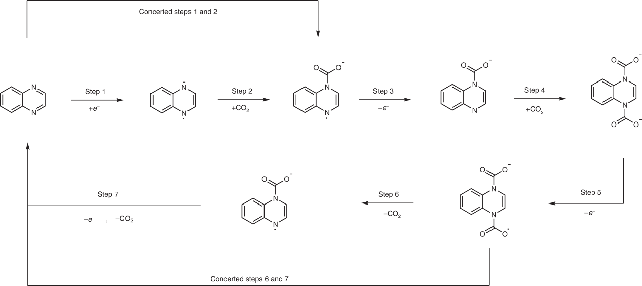 作者使用Gaussian 16软件计算了氧化还原和CO2络合/解离步骤的电势和CO2结合能,并与实验结果进行比较。通过这些计算,研究人员可以了解每个步骤的稳定性和热力学特性,以及不同步骤之间的关系。此外,DFT还用于解释实验中观察到的电化学现象,如CO2对还原电位的影响以及第二次电子转移的阳极偏移现象。通过这些计算,研究人员可以更好地理解碳捕获和释放的机制,并为设计能源高效的碳捕获和释放过程提供指导。