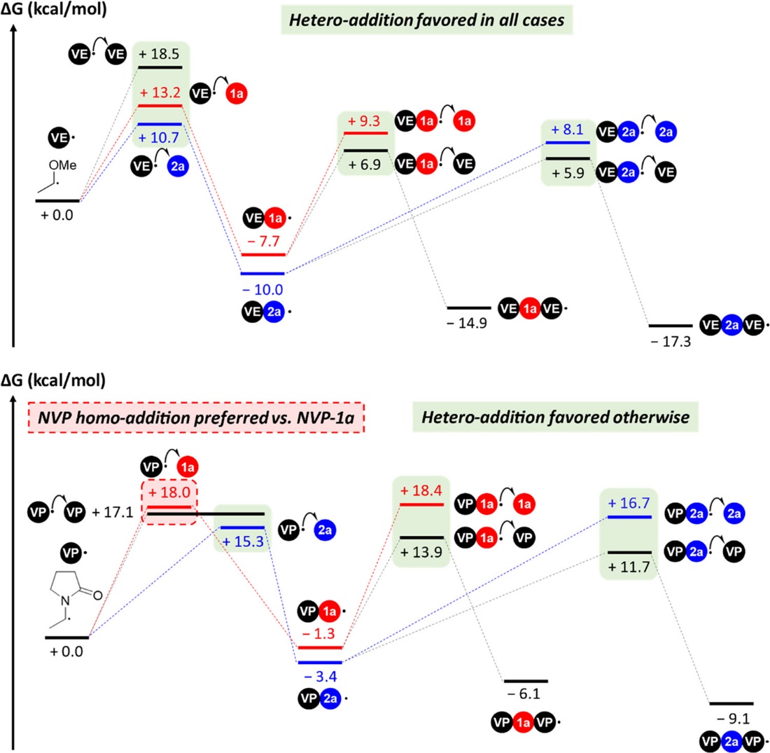 在本文中,DFT计算(Gaussian 16)为这篇文章提供了关键的理论支持和计算数据,帮助揭示了电子不足的丁烯内酯单体在自由基聚合中的重要作用。通过计算一系列单体的HOMO和LUMO能量,以及自由基引发反应的自由能,作者得出了一系列关键结论。首先,电子不足的丁烯内酯单体在自由基聚合中具有较高的反应活性和较强的亲核性。其次,单体的HOMO和LUMO能量可以用来预测单体的反应活性和亲核性。此外,不同单体之间的反应活性和亲核性存在差异,且这些差异可以解释不同单体在聚合反应中的反应速率和产物分布。最后,在自由基聚合反应中,电子不足的丁烯内酯单体可以作为连接丙烯酸酯和马来酸酐的“中间体”,从而扩展了单体的化学空间,为聚合反应提供了更多的可能性。