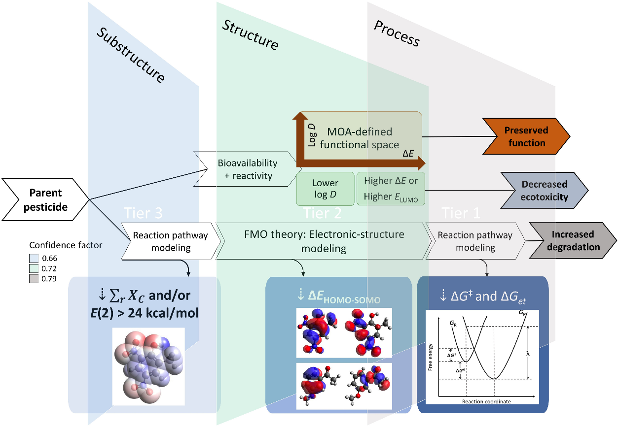 合理设计具有可调降解特性和最小生态毒性的农药是绿色化学的一大挑战之一。本文报告了一个分层计算框架,该框架基于机械衍生的物理化学性质和电子参数的截止值,将间接光降解的动力学和热力学与生态毒性和性能的预测相结合。