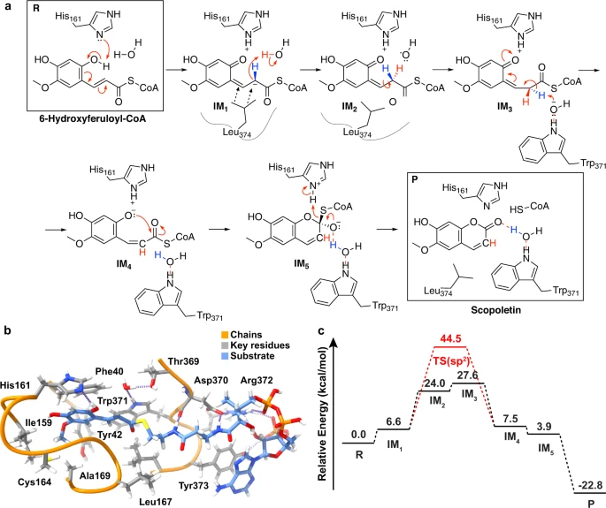 植物含有快速进化的特化酶,支持功能多样化的天然产物的生物合成。在O-羟基化的反羟基肉桂酰辅酶A底物的α碳中发现了独特的质子交换机制。量子力学和分子动力学模拟进一步支持了这种关键机制,用于降低香豆素生产中限速反式至顺式异构化步骤的活化能。
