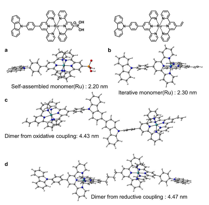图注:钌配合物的理论计算。钌自组装单体的理论长度(a),钌迭代单体的理论长度(b),以及通过氧化反应得到的二聚体(c)或还原反应得到的二聚体(d)。 参考文献:
