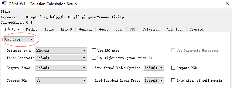 ◆ 红外光谱的计算设置很简单,只要选择Job Type中的Opt+Freq,然后在Method面板选择好方法和基组即可。