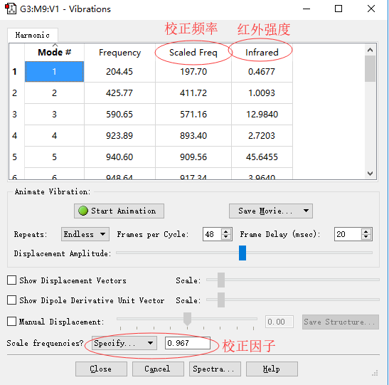 █ 下图中,我们需要使用校正因子让振动频率更加接近实验值。本文中使用的方法B3LYP/6-311G(d,p)对应的校正因子为0.967。更多信息请参考“知识背景”部分。