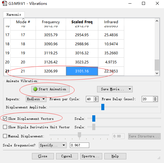 █ 完成上述设置后,点击Start Animation以及勾选Show Displacement Vectors。然后点击每个频率,都会出现相应的振动模式。比如此处我们点击第21个振动模式,对应的频率为3101.16 cm-1,其对应的振动模式如下图所示。