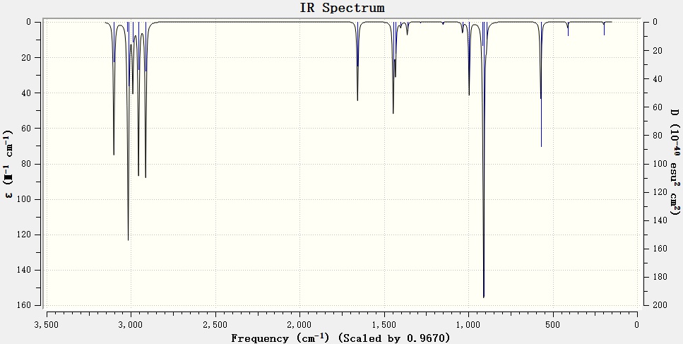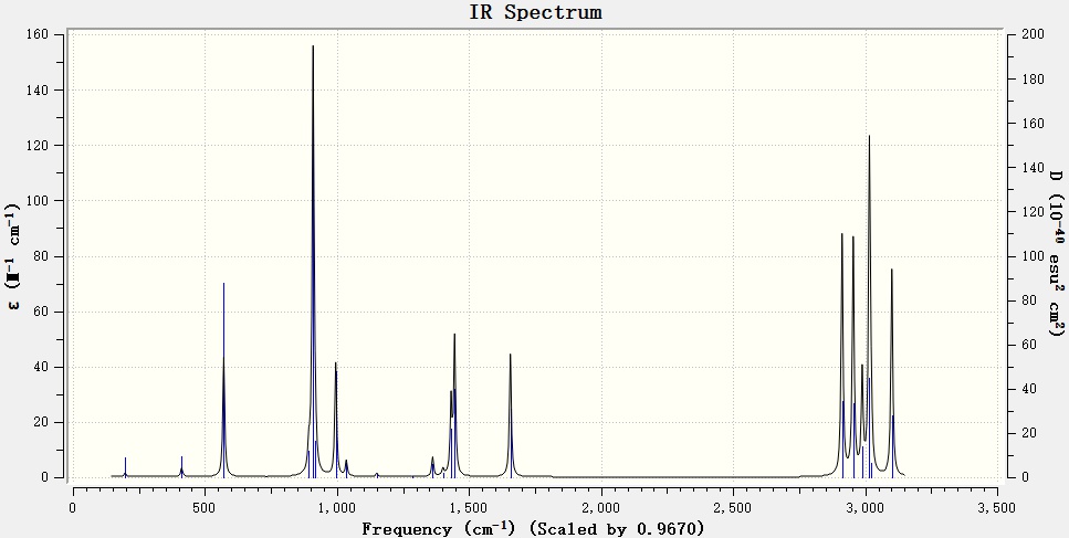 █ 此时点击振动面板中的Spectra,则会生成预测的红外光谱图。如下图所示