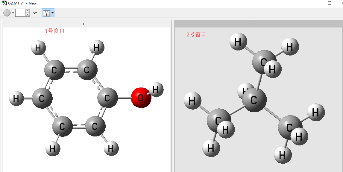 █ 然后分别将选定的结构在1号窗口,用鼠标左键点击-OH键上的H原子,两个不同的产物结构就画好了,如下图: