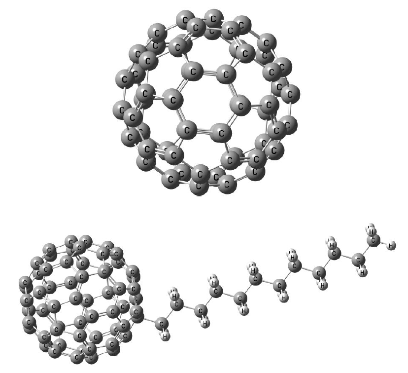 █ 对于C60的十二烷基取代衍生物结构,如果按上述方式添加原子或分子,则所添加的原子或分子不会出现在C60中心,而是出现在整个衍生物的质心。此时,我们需要通过“特定选择”功能