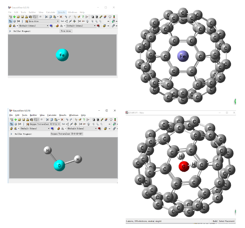 █ 对于C60,我们现在预建模窗口先选好Fe原子或H2O分子,然后点击上面介绍的Builder → Place Fragment at Centroid of Selected Atoms功能,就能在C60分子结构中精准添加原子或分子。如下图所示: