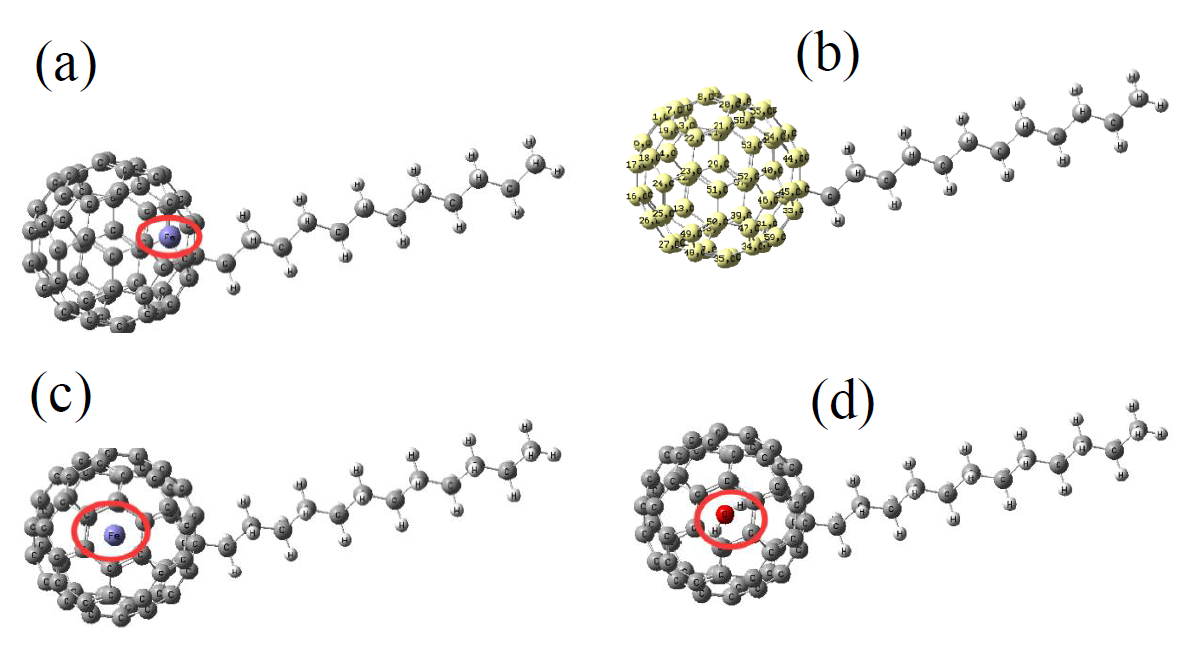 (a) 未使用“特定选择”功能时添加原子的位置及结构 (b) 使用“特定选择”功能,选择C60区域 (c)(d) 使用“特定选择功能”之后添加的Fe原子和H2O分子的位置及其分子结构