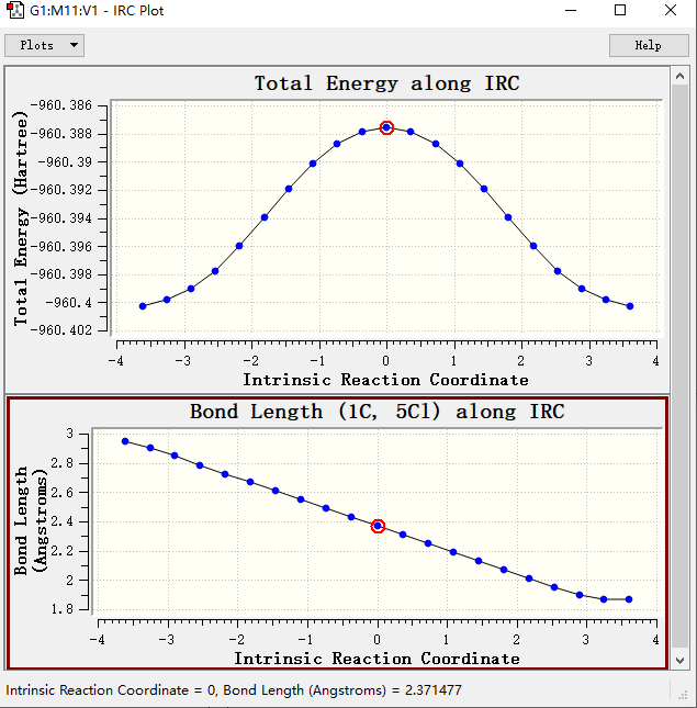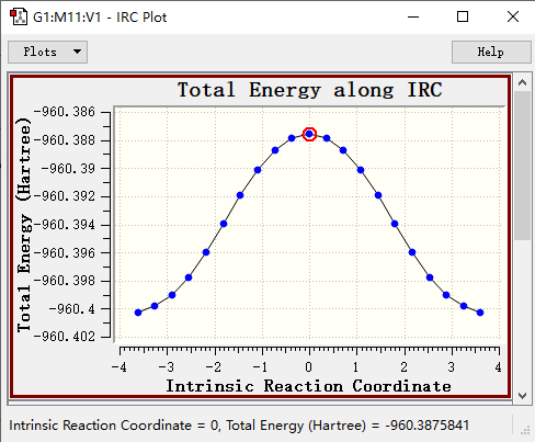 █ 默认步数情况下,会得到21个结构。前后各10个点,第11个为起始点,也就是搜索到过渡态。然后点击Results → IRC/Path,则可以得到IRC的火山图