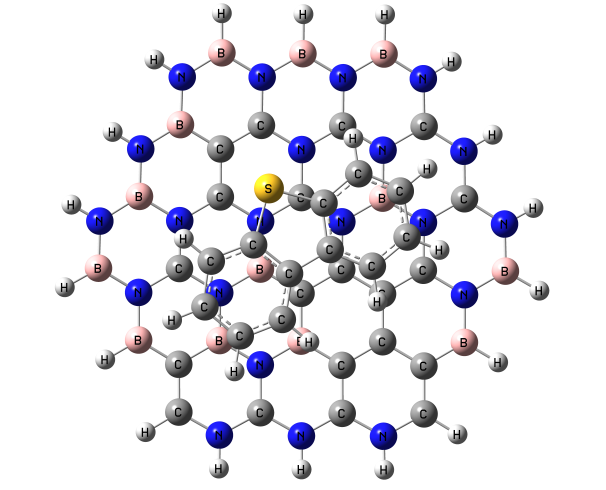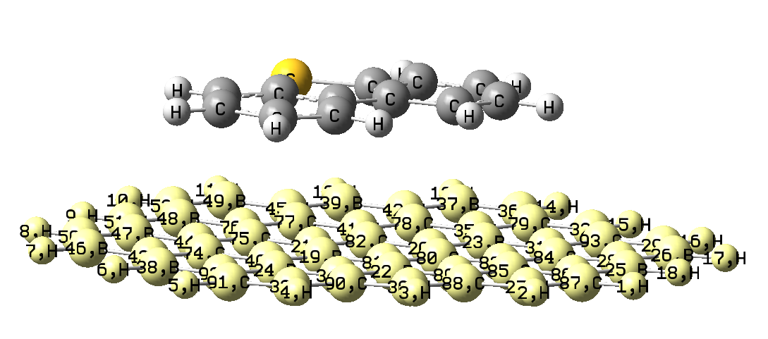 █ 本文以掺C氮化硼为底物,二苯并噻吩为吸附物的体系为例(实际体系可能更大),介绍如何使用GaussView对掺C氮化硼进行固定(即固定侧视图中的下半部分)。