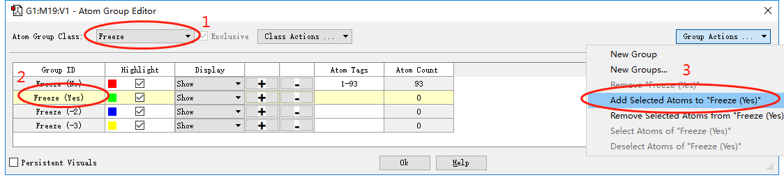 █ 第3步:选择Group Actions中的Add Selected atoms to “Freeze(Yes)”选项。