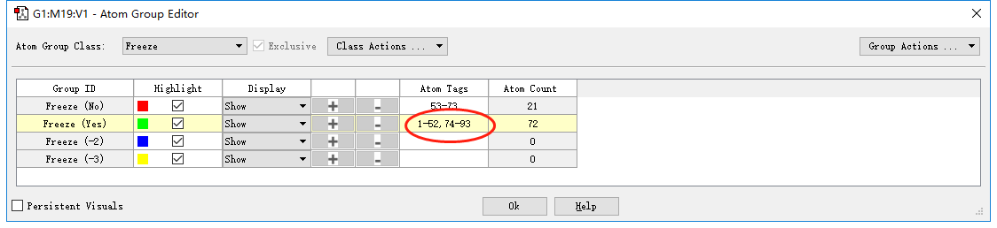 █ 操作结束后,可以看到Atom Tags下,第二行就已经把选择的原子都冻结了。