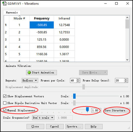 选定第一个虚频,然后勾选Manual Displacement进行手动调整结构。把拉杆图标移到最右边,然后点击Save Structure(下图右)。